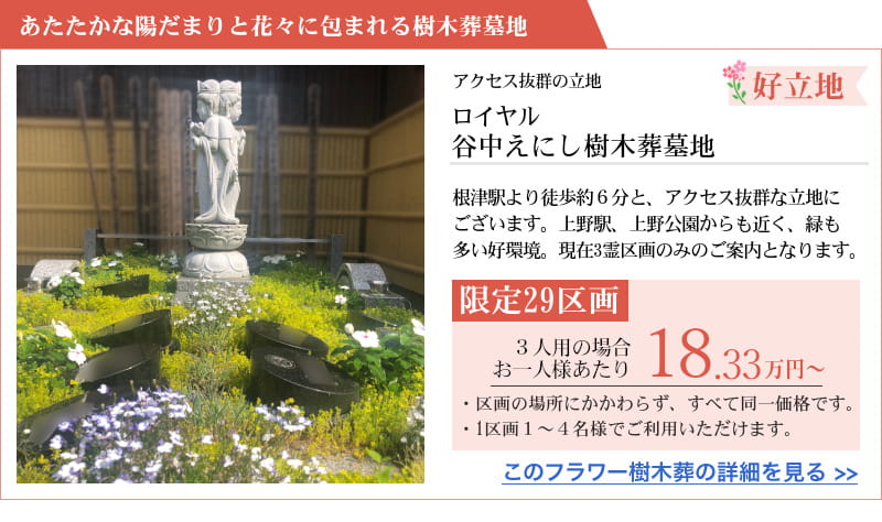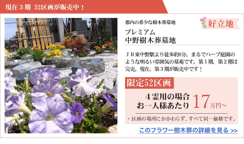 東京都中野区、豊島区西巣鴨、台東区谷中、文京区駒込、神奈川県横浜市・小田原市・藤沢市・茅ケ崎市・愛川町・横須賀市・大磯町、埼玉県久喜市、千葉県野田市、茨城県古河市・栃木県小山市にございますフラワー樹木葬(プレミアムシリーズ、ロイヤルシリーズ、プラチナヒルズ)をご紹介します。各墓地の詳細はクリックをしてご覧くださいませ。