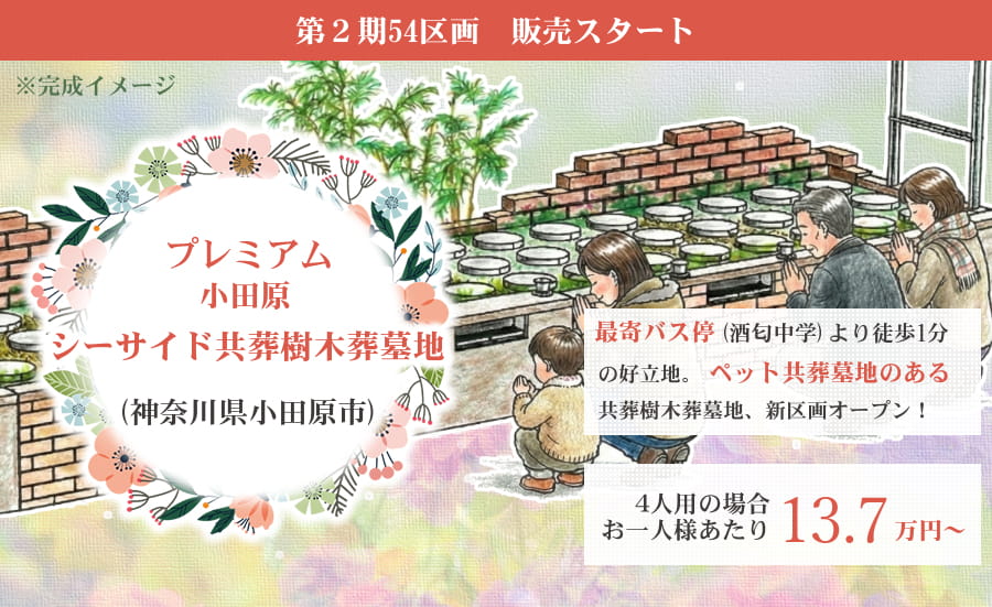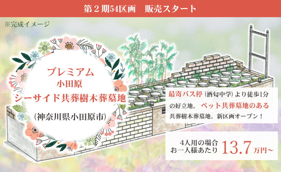 神奈川県小田原市の妙善寺内にある樹木葬墓地「プレミアム小田原シーサイド共葬樹木葬墓地」。現在、第2期54区画を先行販売中! JR東海道線国府津駅、小田原駅から箱根登山バスのご利用が可能。最寄りのバス停「酒匂中学」からすぐの立地が魅力の、愛するペットと共に入れる永代供養付き樹木葬墓地です。