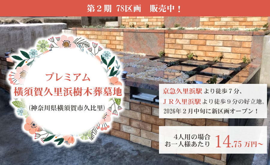 横須賀市久比里の宗円寺内にある「プレミアム横須賀久里浜樹木葬墓地」。現在、78区画を販売中! 美しい草花に彩られ、心地よいぬくもりが漂う樹木葬墓地。京急久里浜駅より徒歩約7分、JR久里浜駅より徒歩約9分という好立地にあり、安心できる低価格が魅力の墓苑です。さらに、どの場所を選んでも金額が変わらない安心の同一価格となっております。契約の最後の方がご納骨されてから個別供養期間が始まるよりも、当初から個別供養期間が明確で永代供養になっている方が後継者も安心です。