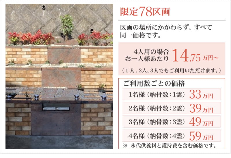 大切なご遺骨を33年間個別に供養。33年後は合祀墓に移し永代にわたりご供養されます。1区画に4霊まで埋葬可能。ご家族のお墓として使用できる永代供養付きの樹木葬墓地です。78区画限定でのご案内となりますので、横須賀市久比里周辺で樹木葬をお探しの方は、ぜひお早目にご検討ください。